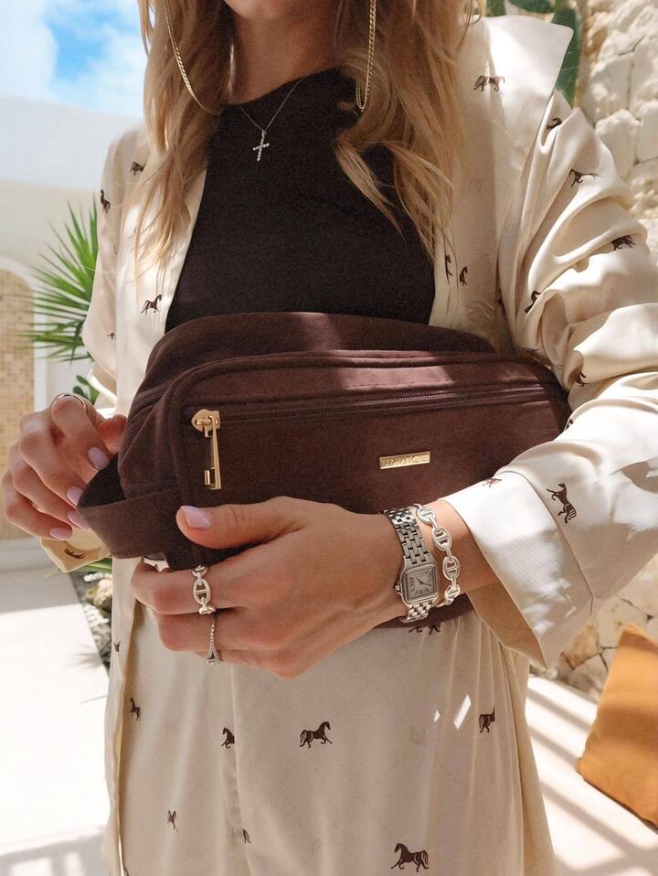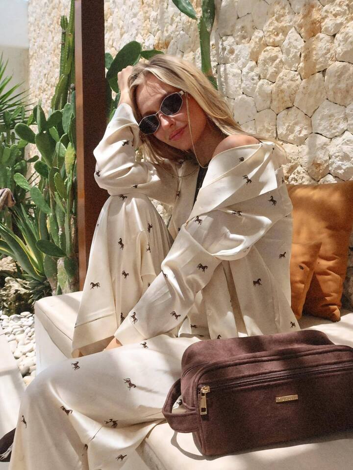 Свой курортный образ Дарья дополнила темно-коричневым боди, замшевой сумкой и солнцезащитными очками. Нагорная использовала украшения из белого металла, она добавила к наряду браслеты, часы, кольца, цепочку для очков и крестик на тонкой цепочке.