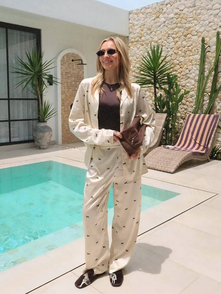 Нагорная умеет стильно одеваться и знает толк в моде. На курорте Дарья щеголяет в светлом брючном костюме в пижамном стиле и модных туфлях-шлепанцах.