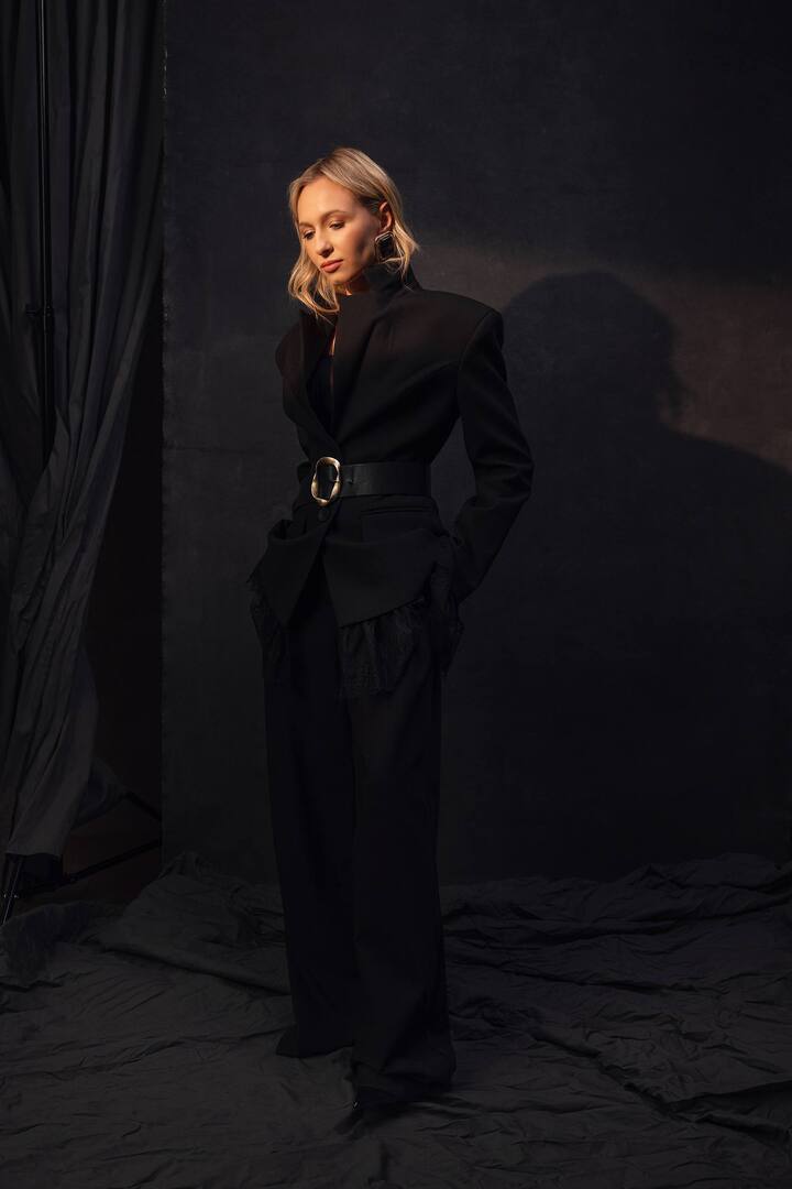 В отличие от жены Никита Нагорный ограничился одним луком. Он выбрал образ в стиле «тотал блэк», надев брюки, пиджак, рубашку, галстук и кеды.