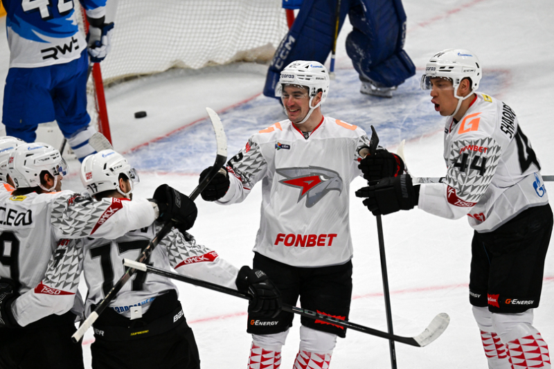 Партнеры поздравляют Дамира Шарипзянова с 20-й шайбой в сезоне / фото: сайт «Авангарда»