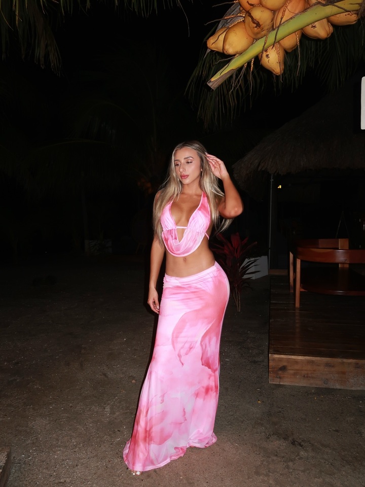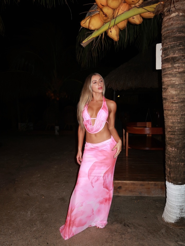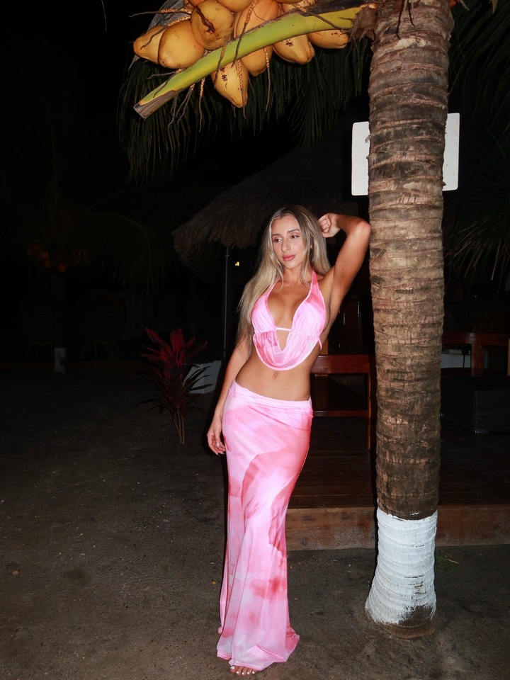 Футболистка-фристайлер снялась после заката рядом с большой пальмой. В первом случае на ней розовый комплект, состоящий из юбки, сидящей на бедрах и топа, едва прикрывающего красивую грудь.