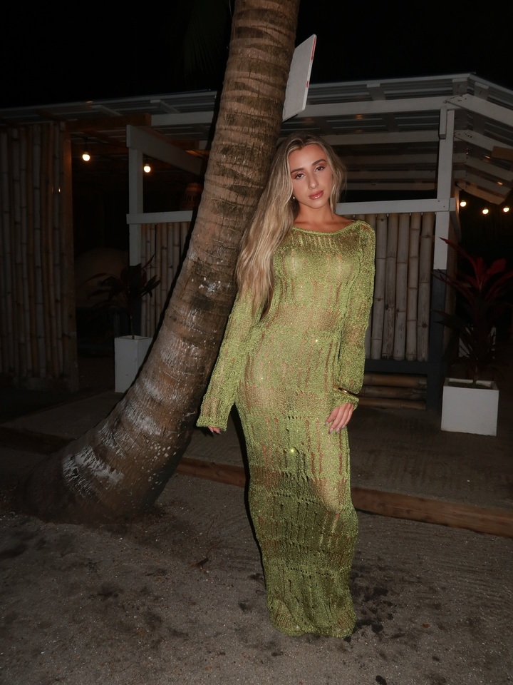 Затем Джессика переоделась в зеленое платье из полупрозрачной ткани. Пикантной деталью этого наряда стала открытая спинка с декольте, доходящим до самых ягодиц.