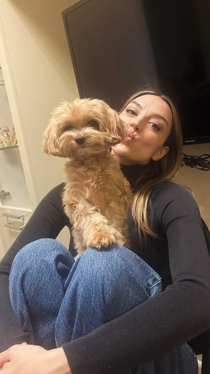 Ноги чемпионки согнуты в коленях, она держит на руках маленькую очаровательную собачку породы мальтипу. Евгения смотрит в камеру, сложив губы уточкой, как будто для поцелуя.