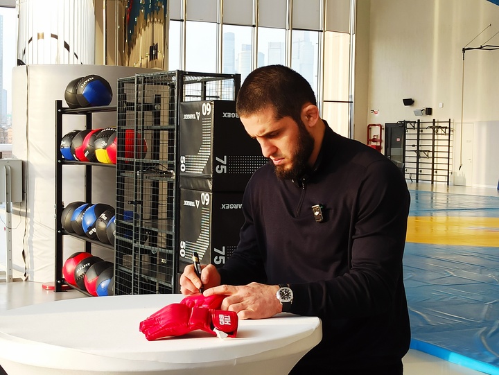 Ислам Махачев подписывает перчатки / МК-СПОРТ