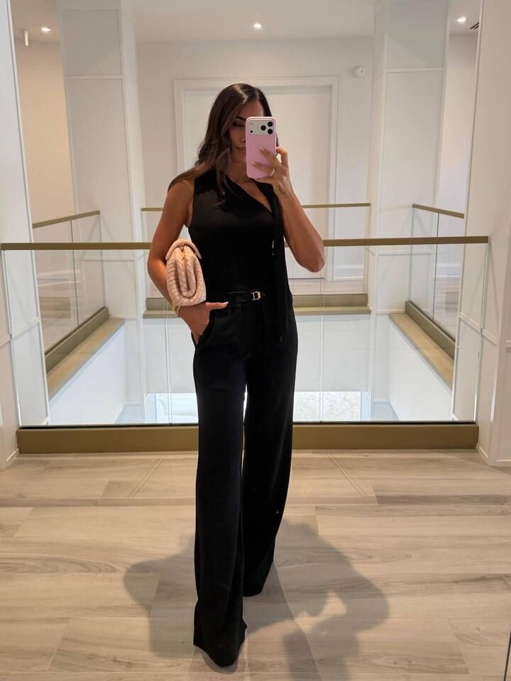 Сначала красивая брюнетка примерила классические черные брюки-палаццо. В первом варианте модель соединила их с топом, украшенным стразами. Затем Антонелла заменила топ жилетом с ассиметричным вырезом и добавила ремень и сумку молочного цвета.