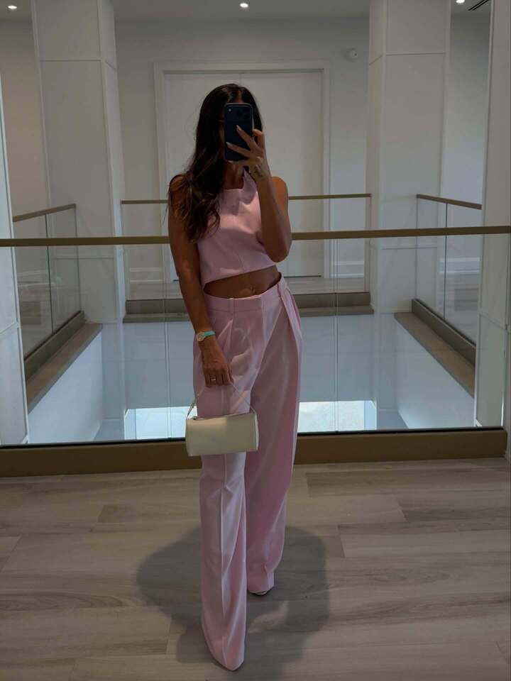 Переодевшись, Рокуццо предстала в нежно-розовом комплекте, состоящем из брюк с защипами на талии и топа с открытой спинкой. Модель сняла себя с разных ракурсов.