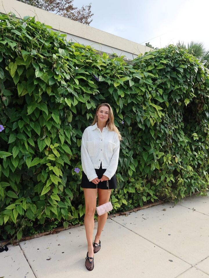 Теннисистка снялась на фоне ограждения, увитого диким виноградом. Анна стоит в полный рост и улыбается на камеру. На ней черные короткие шорты, белая джинсовая куртка и балетки из прозрачной сетки. В руках спортсменка держит сумочку на цепочке.