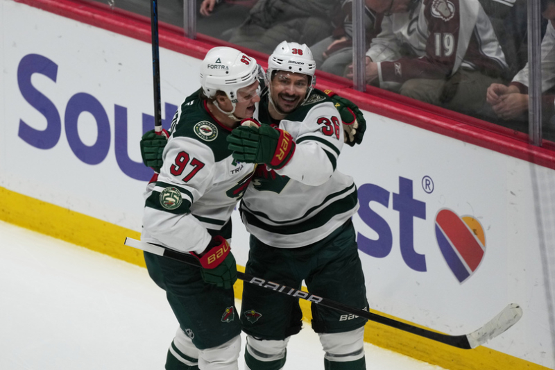 Кирилл Капризов поздравляет Матса Цукарелло-Асена с голом / фото: AP
