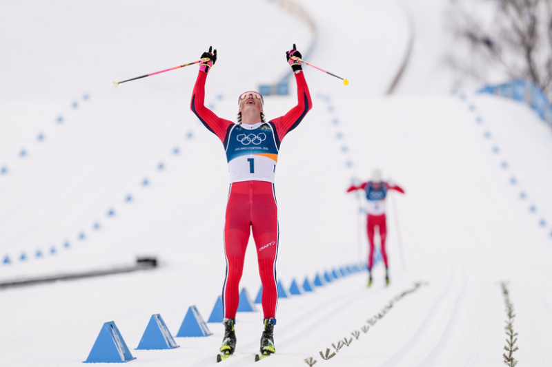Йоханнес Клебо победно скидывает руки на финише марафона ОИ-2026 / фото: AP