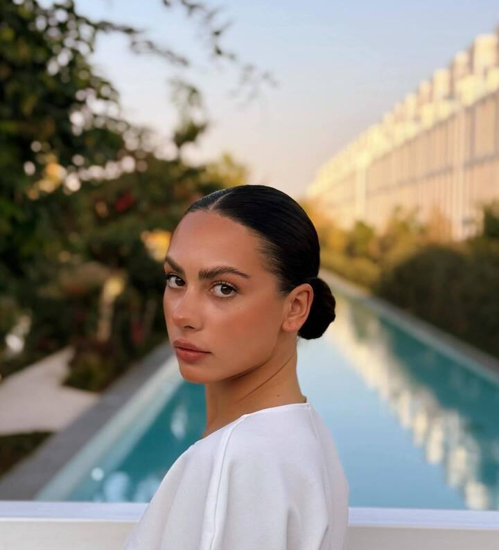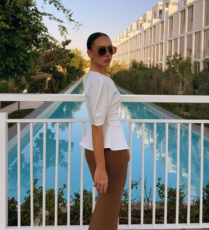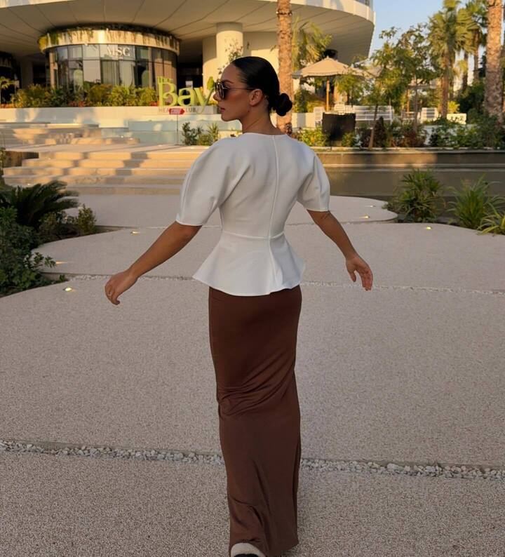 Лала вышла на прогулку в очень элегантном наряде. На ней белая блузка с широкими рукавами и баской, а также коричневая облегающая фигуру макси-юбка.