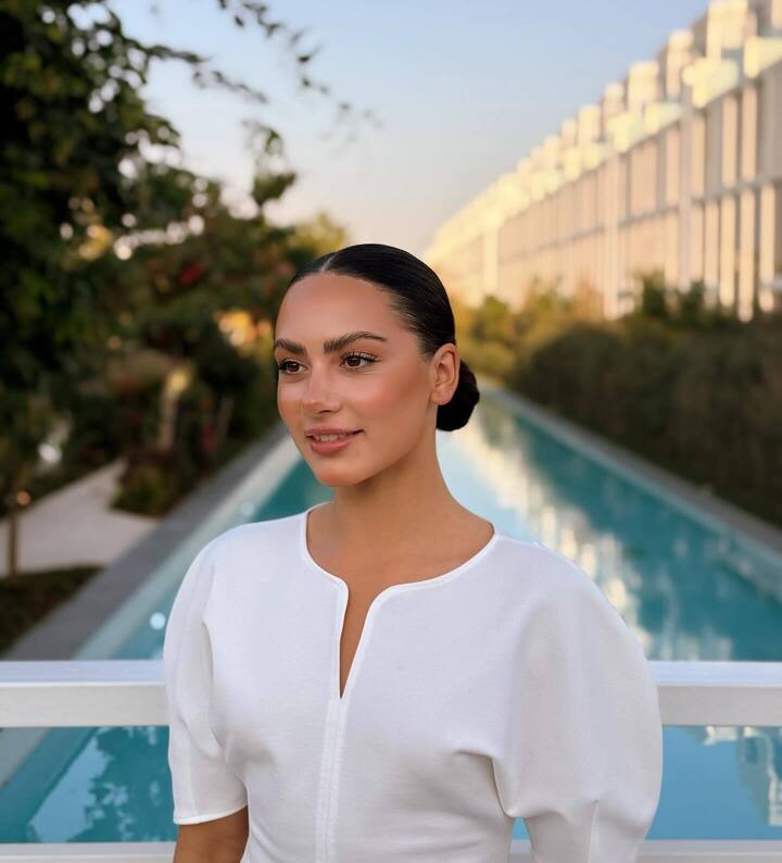 Крамаренко сфотографировалась на территории отеля. Она попозировала на фоне входной группы, а также на мостике у бассейна.