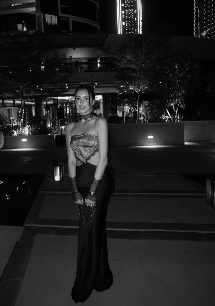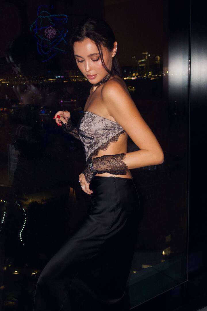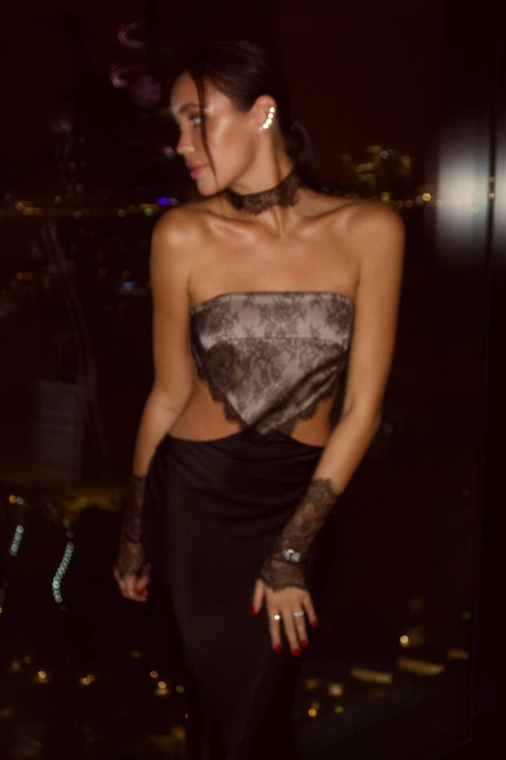 Свой аутфит Евгения дополнила кружевными черными митенками, подходящим чокером и сумочкой-клатчем на цепочке. Макияж с блеском на губах и собранные в низкий хвост волосы сделали образ завершенным.