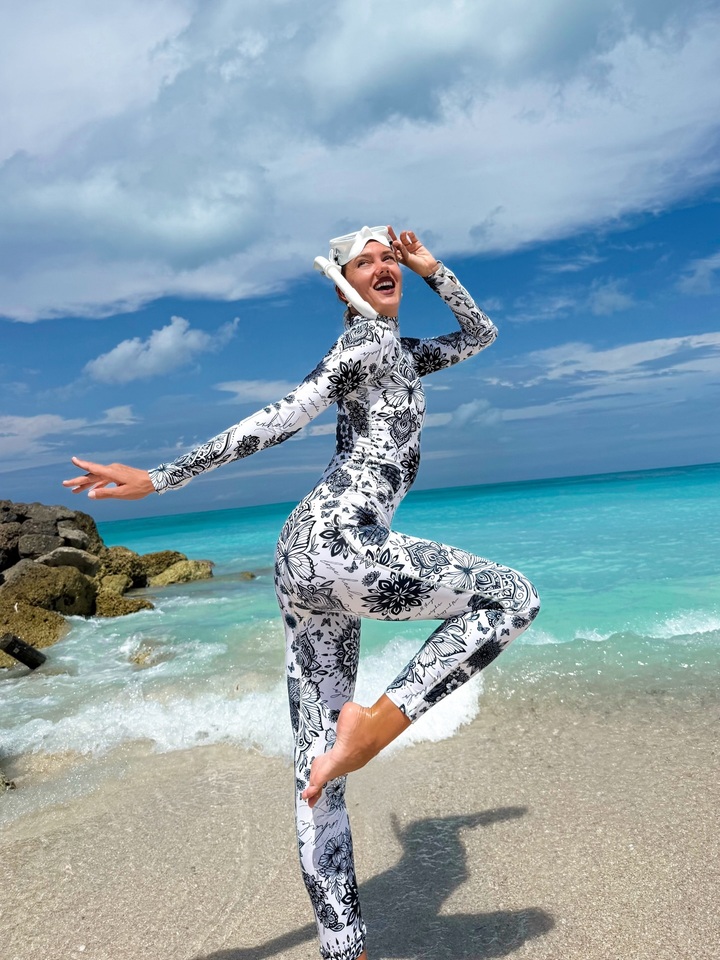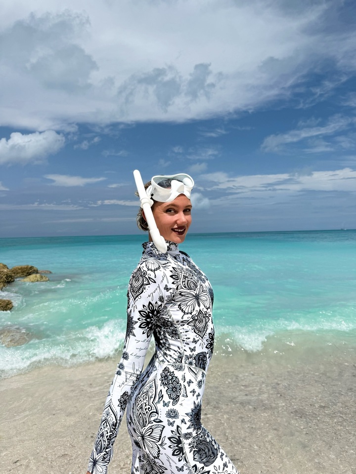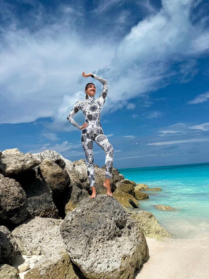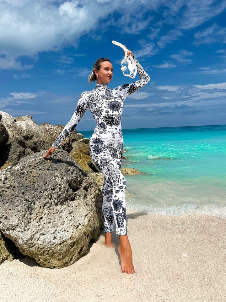 Она запаслась маской для подводного плавания и специальным комбинезоном. Яркая спортсменка выбрала черно-белый костюм с принтом в виде цветов и бабочек. Кристина попозировала на песке и на скалах, а также сделала несколько забавных снимков, состроив рожицы.