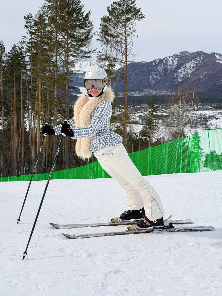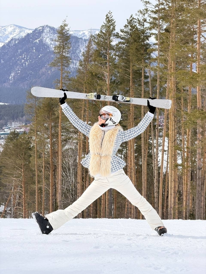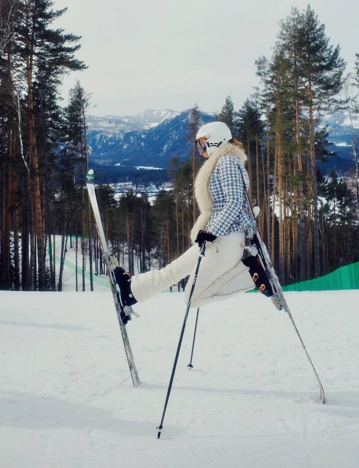 В соцсетях Навки появились отпускные фотографии. Спортсменка каталась на лыжах в необычном костюме. Она надела белые лыжные брюки, облегающие фигуру, и бело-синюю куртку с баской и меховым воротником. К своему наряду Татьяна добавила шлем и горнолыжные очки.