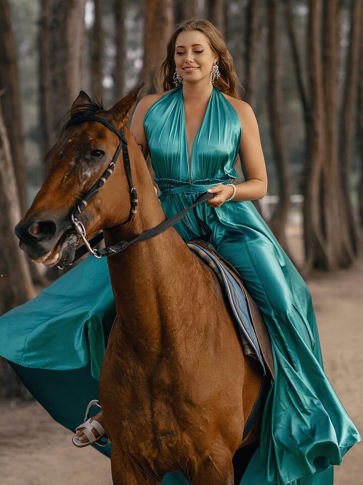 Партнером голубоглазой гимнастки стал не муж, свадьба с которым состоялась совсем недавно в Таиланде, а гнедой жеребец. Бирюкова оделась в шелковое платье бирюзового цвета и снялась в компании коня.