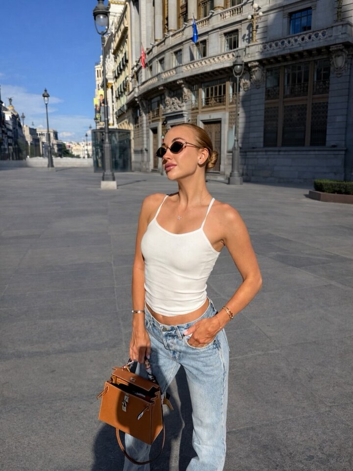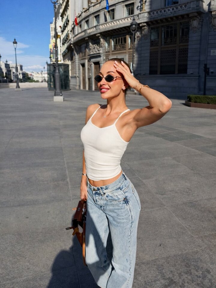 Анастасия вышла на прогулку по городу в удобном и сексуальном наряде. Она надела широкие голубые джинсы и короткую тонкую белую майку на бретелях. Узкая маечка выгодно подчеркнула красивые очертания фигуры.