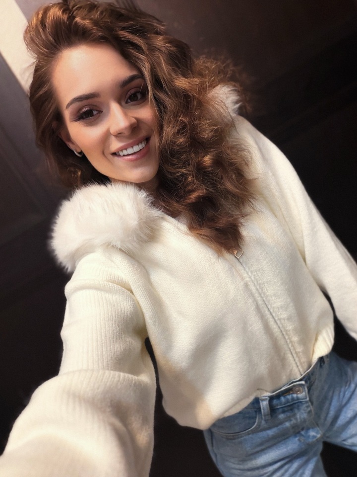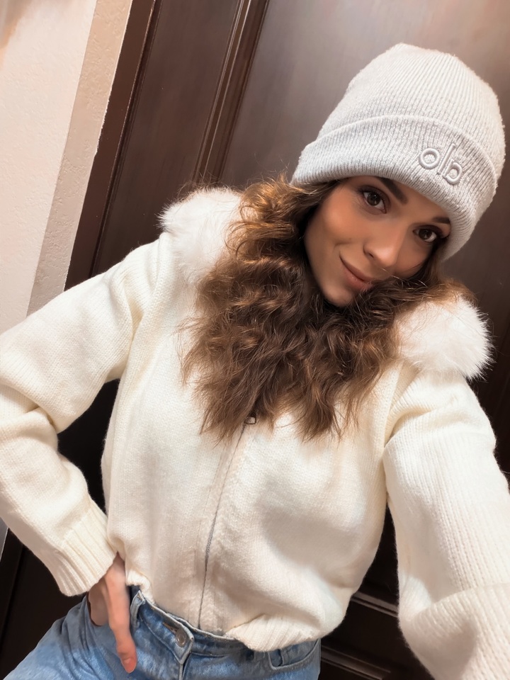 Сотникова сняла себя на фронтальную камеру телефона. Аделина сфотографировалась перед выходом из дома. На ней голубые джинсы и белый вязаный кардиган на молнии. Капюшон кардигана оторочен мехом. На одном из двух снимков фигуристка позирует в серой шапке-бини.