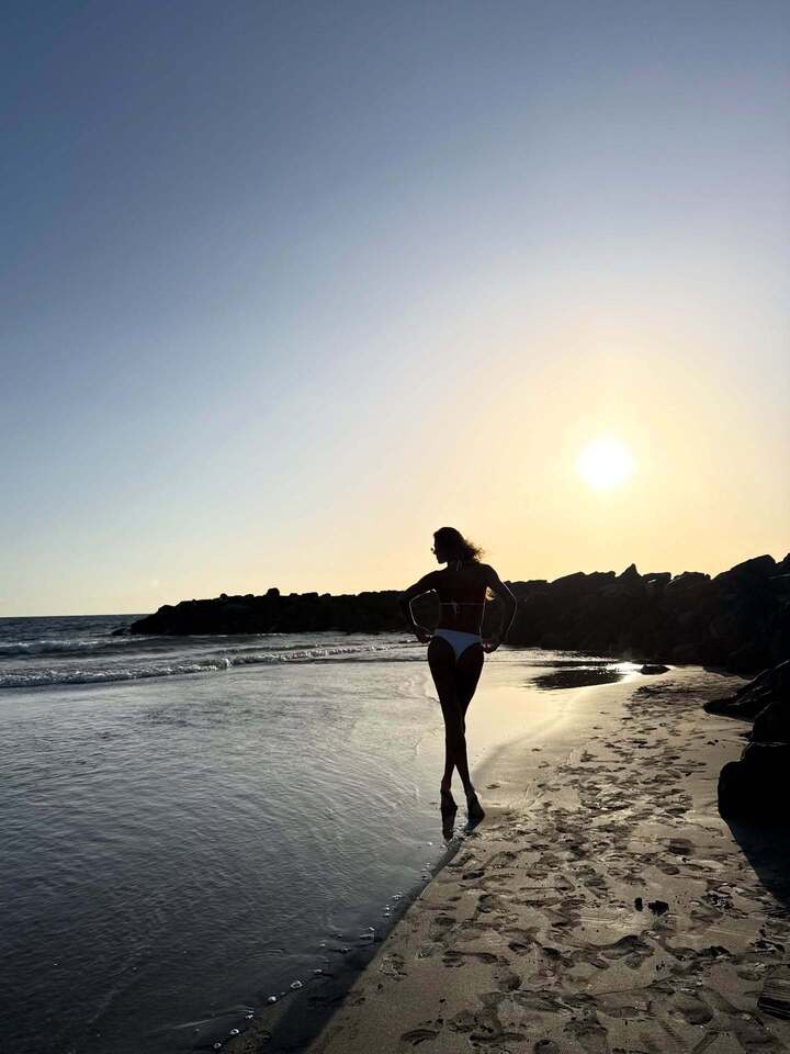 Другие фотографии сделаны на расстоянии. Симакову сняли позирующей на закатном пляже. Анастасия принимала эффектные позы, стоя у самой воды и поворачиваясь к камере разными ракурсами.