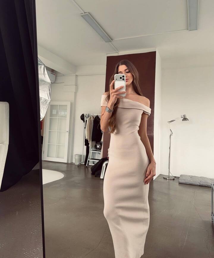 Для фотосессии Александра выбрала трикотажное бежевое платье длины макси с открытыми плечами. Фасон подчеркивает безупречно стройную фигуру матери двоих детей.