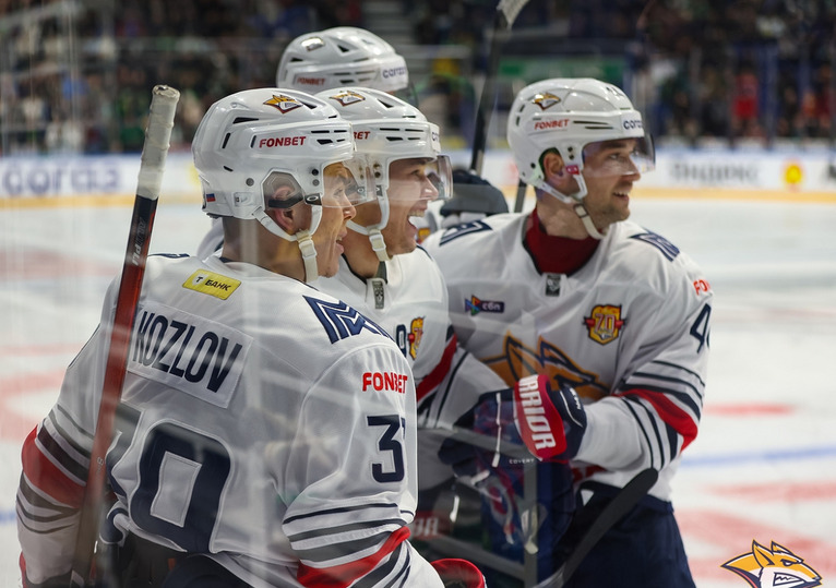 Партнеры поздравляют Романа Канцерова с первым голом в Кубке Гагарина-2026 / фото: сайт «Металлурга»